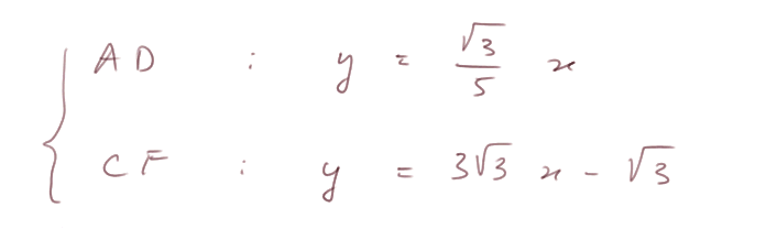 Droite AD : elle passe par l'origine, donc son équation est de la forme y = ax. Et elle passe par D (5/6 ; (√3)/6), donc ça nous donne une contrainte sur "a" :