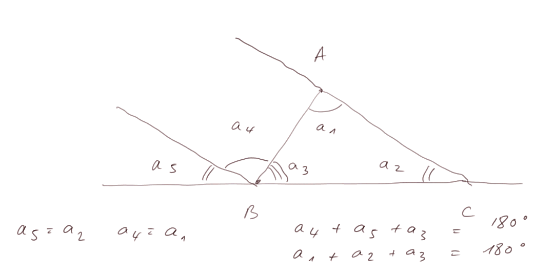 Dans un triangle quelconque, la somme des trois angles internes fait 180°. Pour montrer cela on trace passant par B une droite parallèle à AC, et en raisonnant sur les égalités entre angles, on voit immédiatement que les trois angles du triangle, sont égaux à trois angles autour de B dont la somme fait un angle de 180°, dit "angle plat".