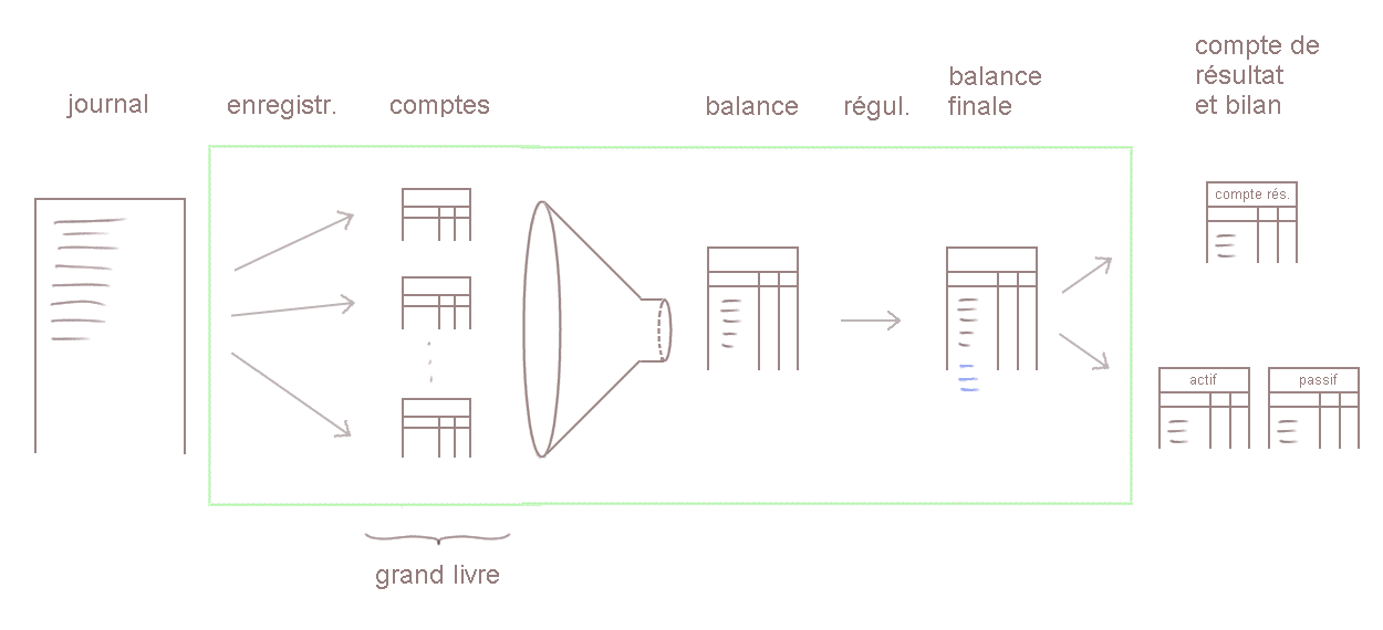 Le processus complet est une séquence mécanique de procédures qui garantit, comme un filet de sécurité, que nous arrivions au compte de résultat et au bilan corrects.