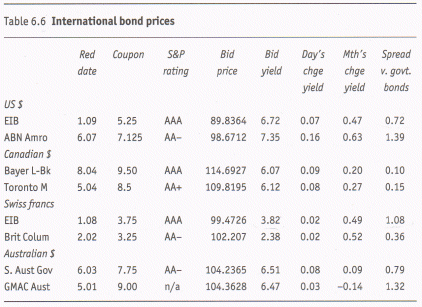 For example, the first line presents data on a bond issued by the European Investment Bank some years ago and maturing in January 2009. Its coupon rate is 5.25%, which means that it pays yearly 5.25% of its face value. The going price at the time the table was published was 89.8364% of face value. Therefore its yield must be higher than 5.25%. Indeed the table gives 6.72%. (And we see that the bond is only 0.72% above government bonds of the same characteristics, so it is considered safe.) As an exercise on calculations about bonds, this figure of 6.72% enables us to calculate approximately when the table was published. Indeed we only have to check with how many years to go, a current price of 89.8364% (of face value) and coupons of 5.25% (of face value) represent an investment with IRR = 6.72%. Doing this with an Excel spreadsheet, we obtain 9 years. Therefore the table was published around January 2000.