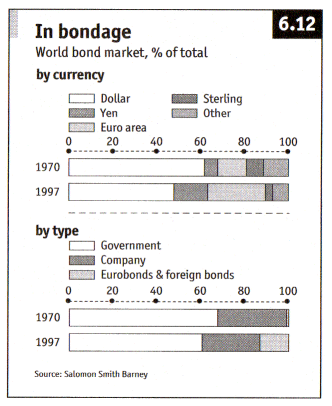 Source: "Economics, Making Sense of the Modern Economy", Edited by Simon Cox, The Economist Press, 2006, p158 By types: government bonds, followed by company bonds, still played the major roles in 1997. But the foreign and eurobonds began to be important. By currency: the dollar was still dominant in 1997, but the other currencies represented slightly more than half. In 2008 the trend was even more pronounced.