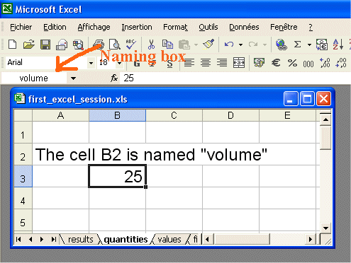 - In the sheet "quantities" we renamed the cell B3 "volume" (see the Naming