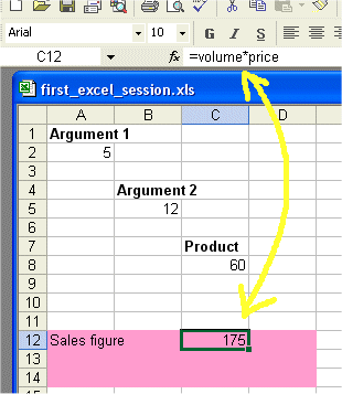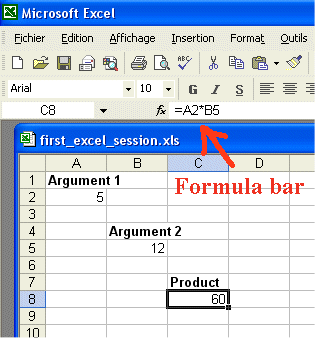 - C8 : the formula =A2*B5, but here we view the result of the formula,