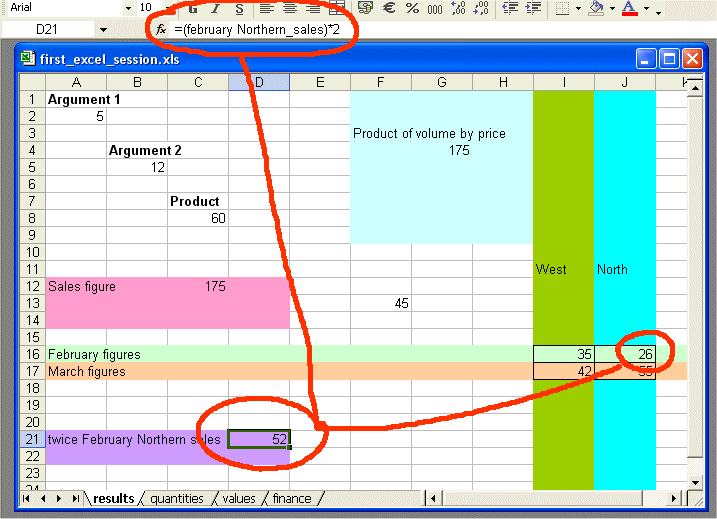 - In cell D21 we entered the formula "=(february Northern_sales)*2"