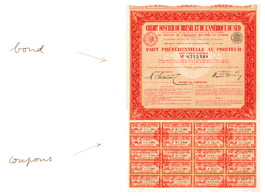 Bondholders are entitled to regular payments, called coupons, because bonds used to be sheets of paper, from which you would tear off "coupons" to take to the bank managing the firm's bond and get your payments.